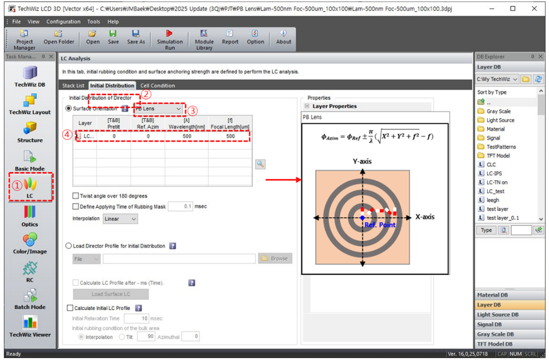 c) ①加載項(xiàng)目文件并選擇LC選項(xiàng)卡→ ②初始分布→ ③選擇平面光柵的表面方向→ ➃設(shè)置表面方向