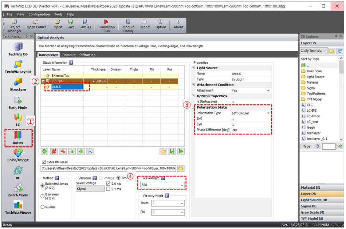 d) ①選擇光學(xué)選項(xiàng)卡→ ②疊加光源→ ③設(shè)置偏振類型(左旋圓偏光)→ ➃ 設(shè)置波長(zhǎng)