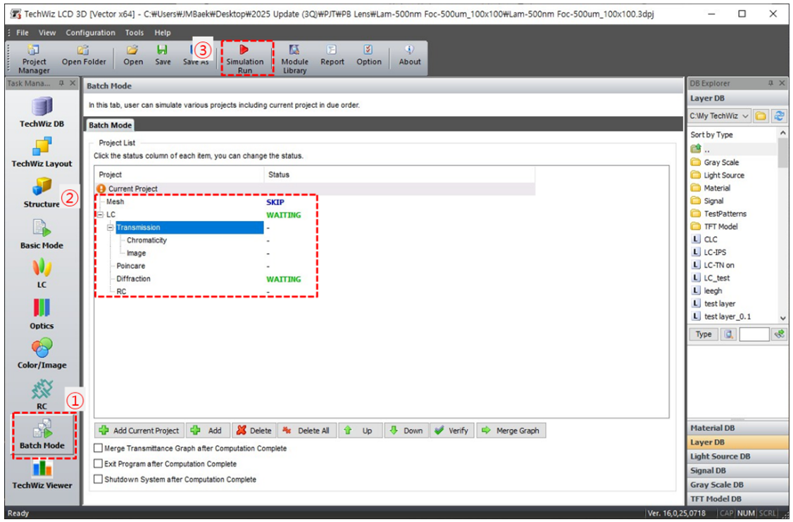 f) ①選擇批處理模式→ ②設(shè)置狀態(tài)→ ③ 運(yùn)行仿真