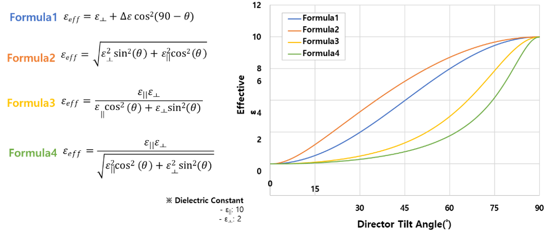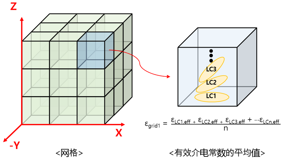 將模擬結(jié)構(gòu)劃分為網(wǎng)格,計(jì)算每個(gè)網(wǎng)格LC的有效介電常數(shù)的平均值。