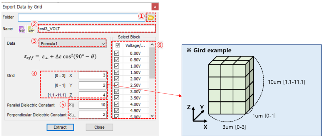 c) ①設(shè)置文件保存路徑→ ②設(shè)置文件名→ ③選擇有效介電常數(shù)公式→ ➃設(shè)置網(wǎng)格(劃分?jǐn)?shù))→ ⑤設(shè)置LC介電常數(shù)→ ⑥選擇電壓或時(shí)間