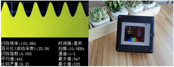 波動(dòng)深度是本機(jī)測(cè)量的主要指標(biāo),下圖非常典型的頻閃波動(dòng)波形,最后一欄評(píng)價(jià)頻閃的嚴(yán)重程度:本例為比較嚴(yán)重(8.2)。