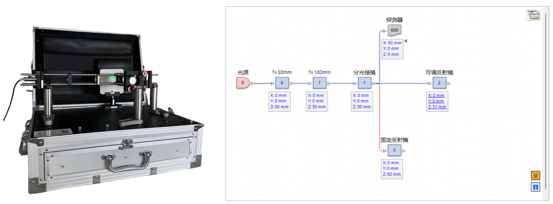 光學(xué)實(shí)驗(yàn)是理解光學(xué)原理,培養(yǎng)科學(xué)探究能力,驗(yàn)證光學(xué)定律與現(xiàn)象,推動技術(shù)創(chuàng)新與應(yīng)用的重要組成部分。因此,訊技光電自主研發(fā)一款光學(xué)實(shí)驗(yàn)教具,針對各大高校的光學(xué)課程,教具集成了各類光學(xué)實(shí)驗(yàn)。該實(shí)驗(yàn)教具內(nèi)部包含各種各樣的儀器和設(shè)備,例如光源、透鏡、反射鏡、空間光調(diào)制器、DOE等等。當(dāng)學(xué)生在課堂上學(xué)習(xí)抽象和難以理解的光學(xué)原理和現(xiàn)象時,一方面可以使用實(shí)驗(yàn)教具中的VirtualLab Fusion,進(jìn)行光學(xué)仿真,另一方面,可以使用光學(xué)實(shí)驗(yàn)教具,實(shí)現(xiàn)虛實(shí)結(jié)合,在實(shí)踐中理解這些概念和內(nèi)容。