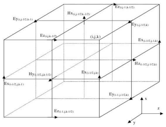 FDTD依賴于求解域的空間和時間的離散化。耦合的電磁場沿著由Yee單元組成的網(wǎng)格進行離散化。磁場和電場分量以交錯的方式定位在每個單元的邊緣上。 通過計算立方體的相對邊緣上的兩個場分量之間的有限差分,可以獲得場的空間導(dǎo)數(shù)的二階近似。有限差分法同樣用于近似場的時間導(dǎo)數(shù)。用于計算和更新每個時間步的電場和磁場的模擬空間的算法稱為Yee算法。當空間和時間步長趨于零時,計算問題的解的精度應(yīng)收斂。這種增加的準確性是以完成模擬所需的時間和存儲模擬所需的內(nèi)存為代價的。