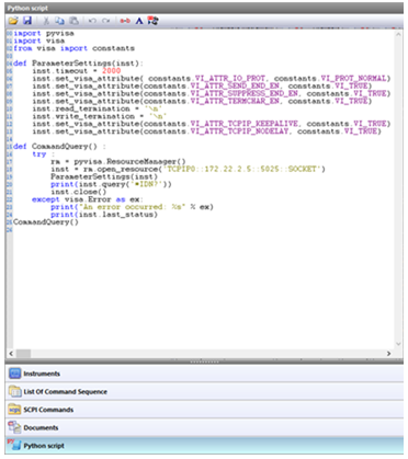 OptiInstrument軟件支持Python腳本編寫。 使用該工具為單個SCPI命令或命令列表生成Python腳本。 生成的腳本可以保存到文件中。 可以從OptiInstrument GUI或命令提示符或Windows PowerShell中執(zhí)行生成的腳本。 可以將Python腳本加載到OptiInstrument GUI中并由該GUI執(zhí)行。 圖3顯示了為一系列SCPI命令生成的Python腳本,并顯示在GUI Python腳本窗格中。 此功能使用戶可以執(zhí)行OptiInstrument GUI不支持的功能,例如邏輯控制和循環(huán)選項。
