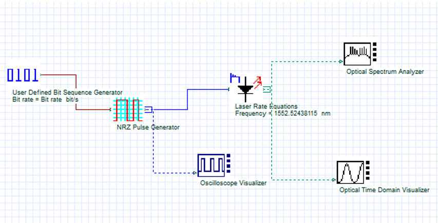 本案例展示了直接調制半導體激光器的大信號特性。顯示了實現粒子數反轉以產生增益和調制所需的延遲時間。