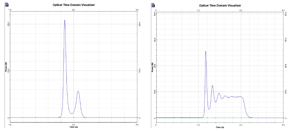 而在接下來的兩幅圖中,顯示了調制峰值功率電流I=50mA的生成光脈沖。在圖3左側的圖中,IB=10mA,低于默認值Ith=33.46mA,在右側的圖中IB=Ith=10mA。在IB=10mA的情況下,當我們取T=Tsp時,根據上述公式,td約為0.6ns。