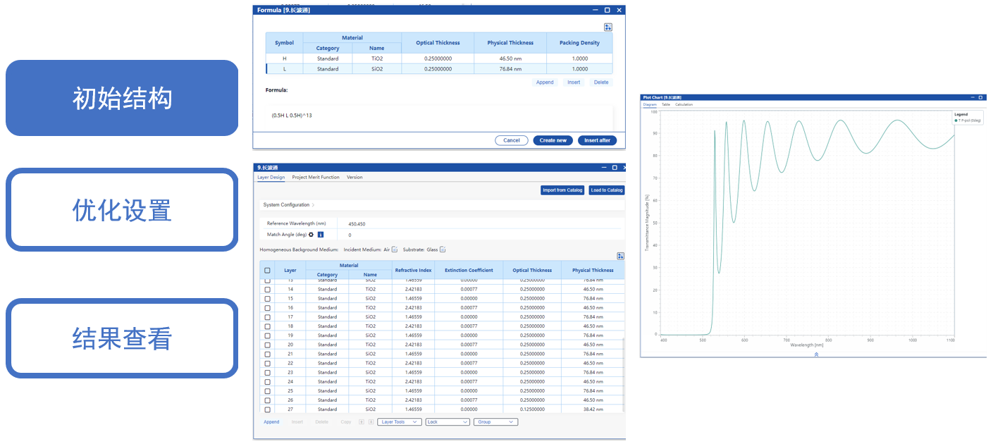 使用公式工具構(gòu)建了上述膜系作為基礎(chǔ)結(jié)構(gòu),右圖展示了其在400-1100 nm內(nèi)0°入射時(shí)的光譜。可以看出此時(shí)在的透射波段有很多的波紋。