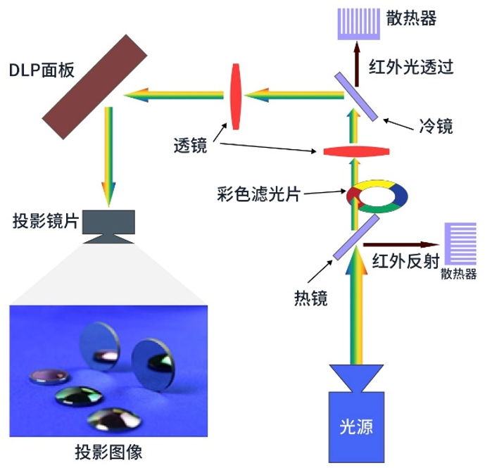 在投影機中,光學(xué)薄膜在提高光學(xué)效率和減少光損耗方面發(fā)揮著重要作用,其中冷光鏡是一個關(guān)鍵部分。冷光通過反射光源中的可見光并允許紅外光透過,有助于提高圖像質(zhì)量并減少系統(tǒng)中的熱負荷。