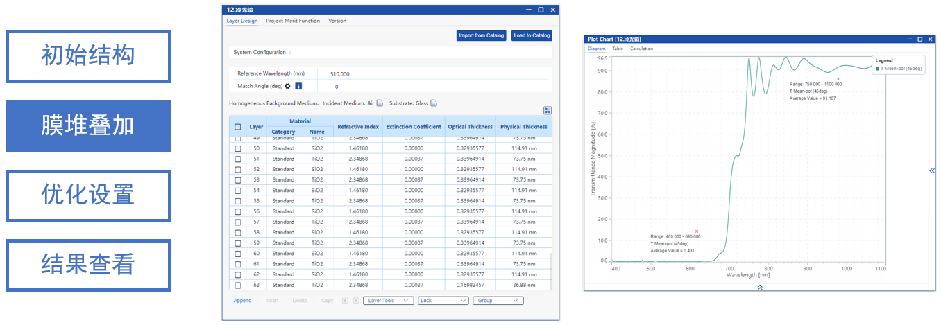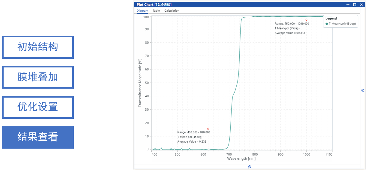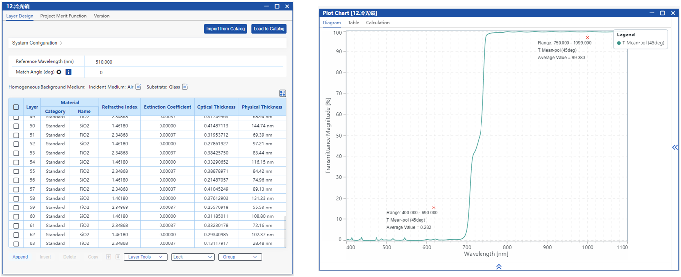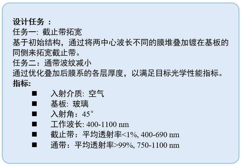 設(shè)計一款冷反射鏡,在初始膜系結(jié)構(gòu)的基礎(chǔ)上,通過拓寬截止帶并減小通帶波紋,以提升整體光譜性能,目標(biāo)是在45°入射角下實現(xiàn)400–690 nm波段內(nèi)平均透射率低于1%,在750–1100 nm波段內(nèi)平均透射率高于99%。