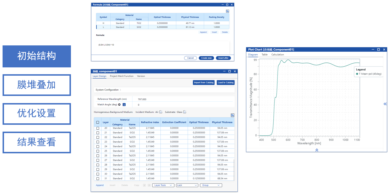 使用公式工具構(gòu)建了上述膜系作為基礎(chǔ)結(jié)構(gòu),右圖展示了其在可見光波范圍內(nèi)45°入射時的光譜。可以看出此時通帶波紋較大,截止帶的寬度也不達標(biāo)。