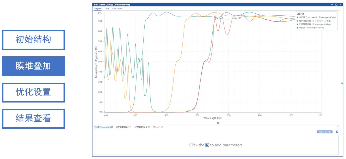 使用光譜圖中的“項目合并”功能,將三個中心波長不同的膜系進行疊加,并預(yù)覽合并后的光譜響應(yīng),從而實現(xiàn)截止帶的拓寬。圖中的紅色曲線為合并后的光譜結(jié)果,可見截止帶寬度得到了顯著提升。