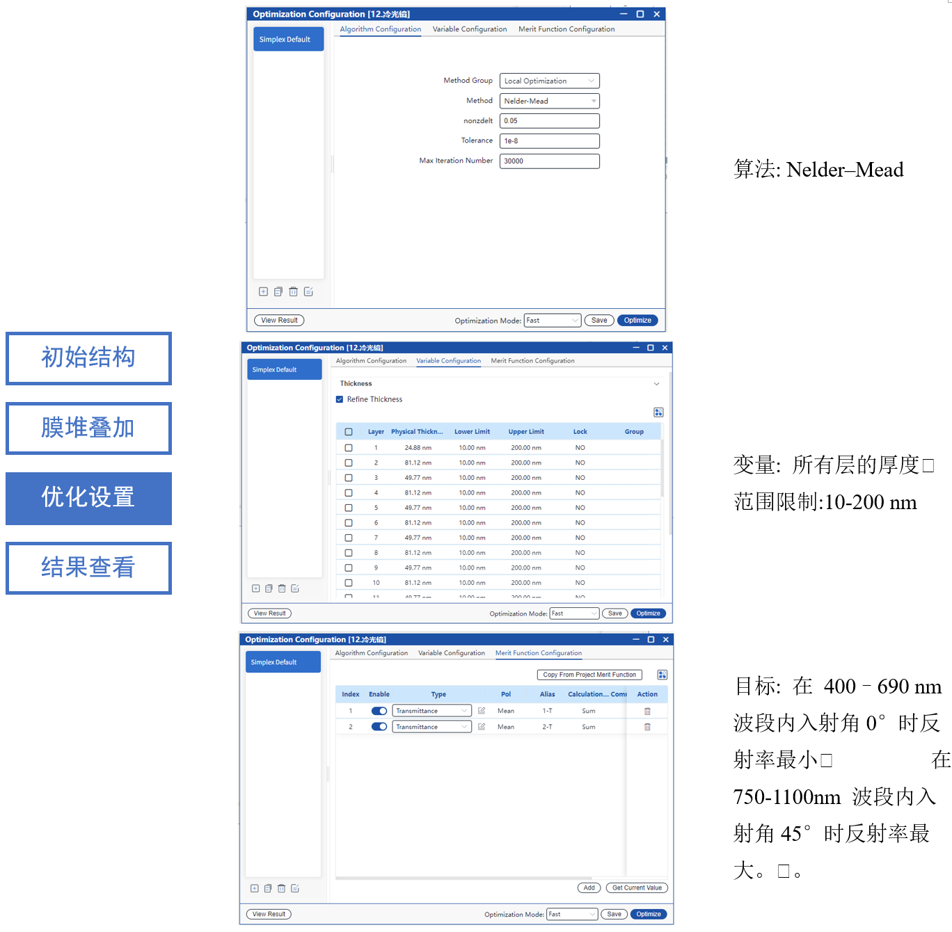 通過 Nelder-Mead 算法優(yōu)化所有層的厚度,目標(biāo)是在45°入射時,750-1100 nm最大化透射率,400-690 nm最小化透射率。