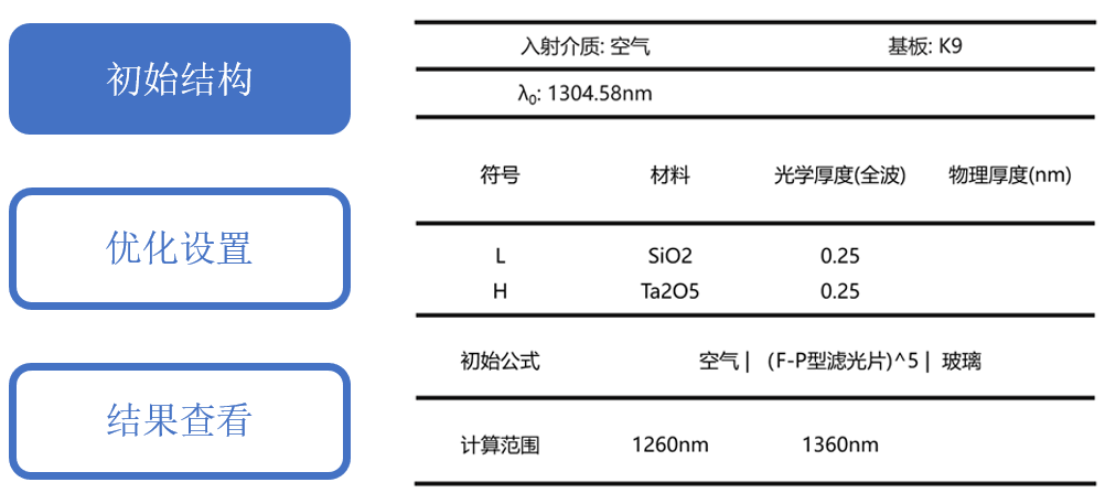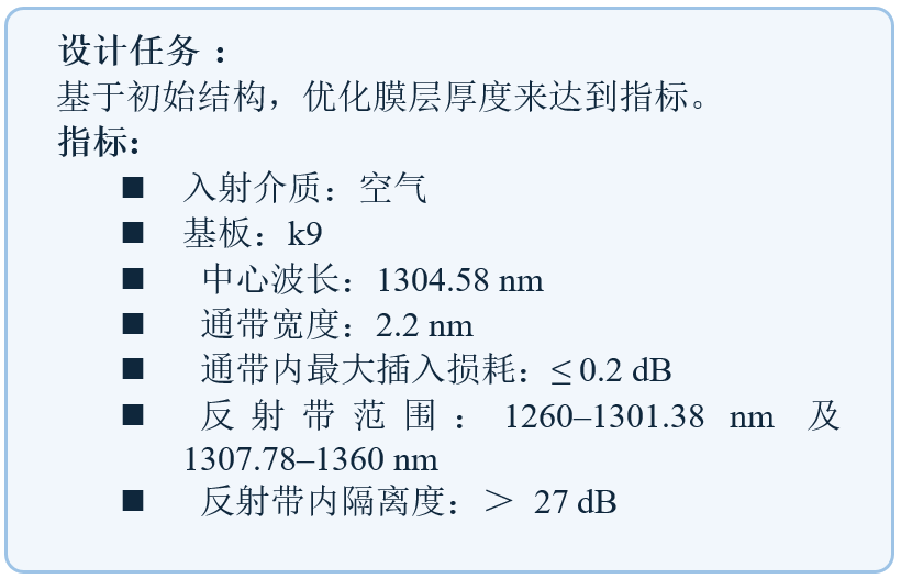 光通信窄帶濾光片需要實現(xiàn)某一特定波長的信號傳輸并且強烈抑制相鄰波長的干擾。本案例中通過合理的初始結(jié)構(gòu)生成,以及進一步優(yōu)化層厚度,目標是實現(xiàn)中心波長在1304.58nm,帶寬2.2nm,通帶最大插入損耗小于0.2dB,1260-1301.38nm以及1307.78-1360nm為反射帶,反射帶的反射隔離度大于27dB。