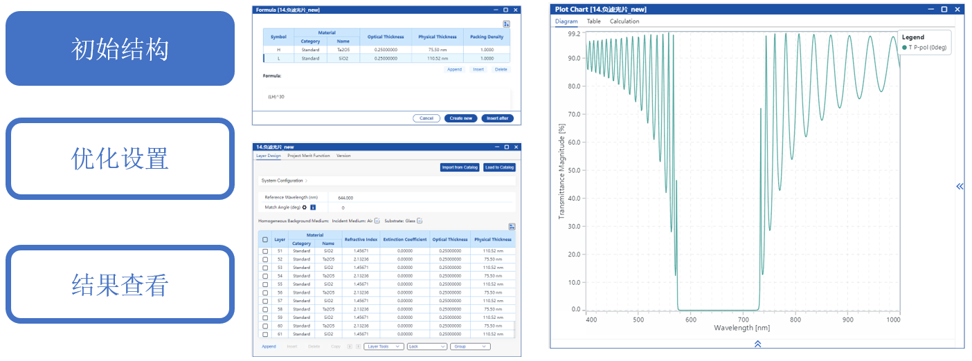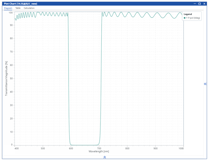在本應用案例中,選用了常規(guī)的1/4波長堆棧作為初始結構。首先通過手動調(diào)整低折射率層和高折射率層的厚度,獲得截止位置和帶寬均符合要求的高反射區(qū);隨后進一步優(yōu)化膜層厚度,設計出一種負濾光片,其截止范圍為600–700 nm,通帶覆蓋400–590 nm和710–1000 nm。