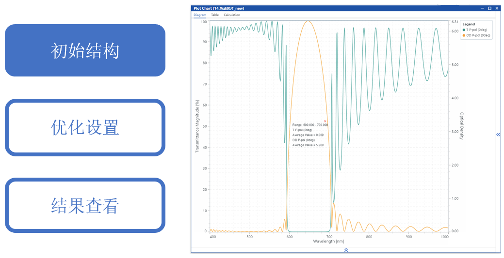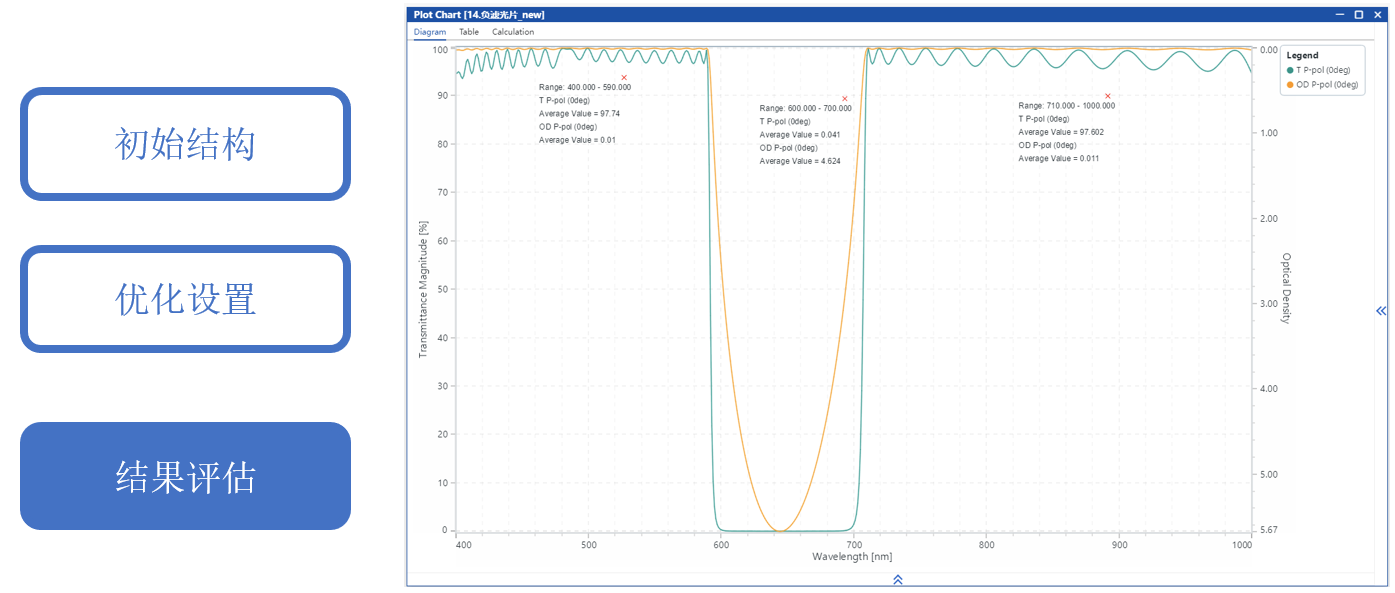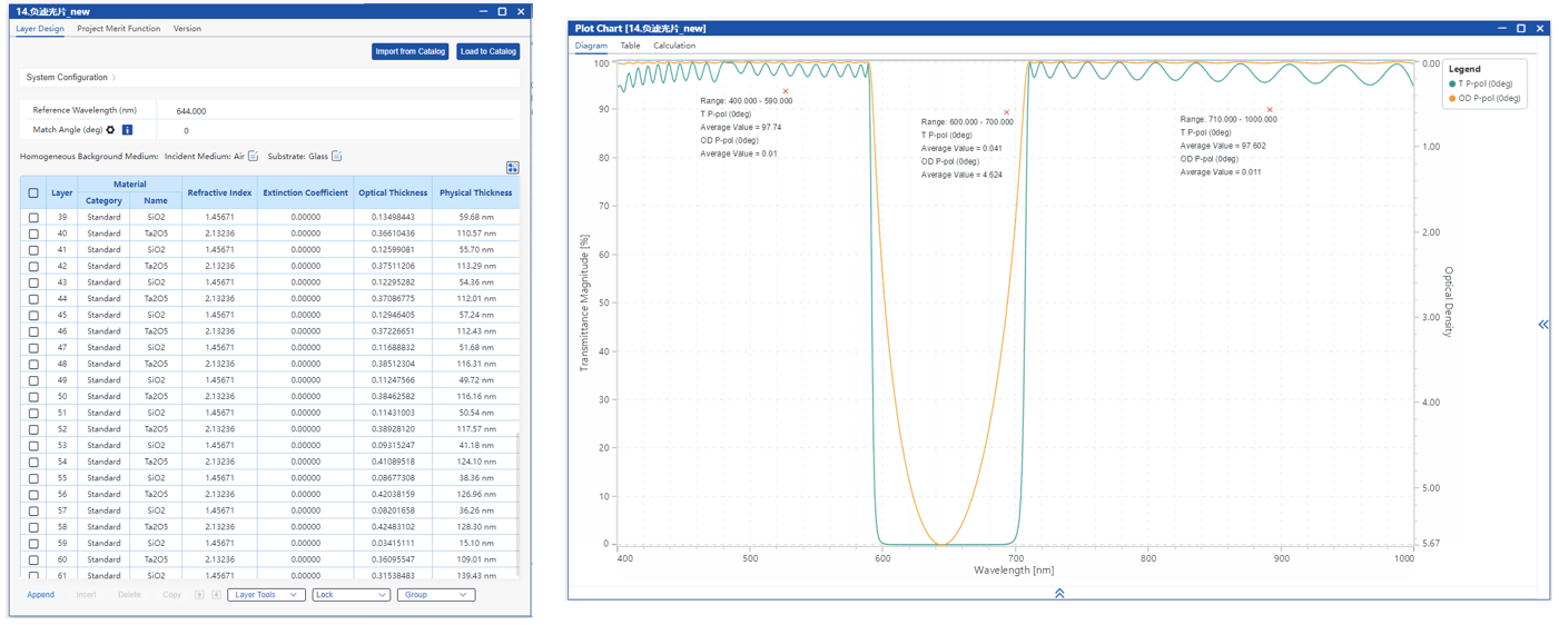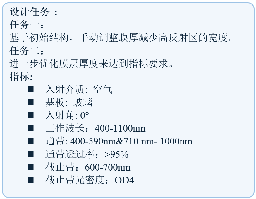 通過手動調(diào)整初始結構并優(yōu)化層厚度,目標是在0°入射時,600-700 nm截止,平均光密度>4。400-590 nm和710-1000 nm透過,平均透射率>95%。