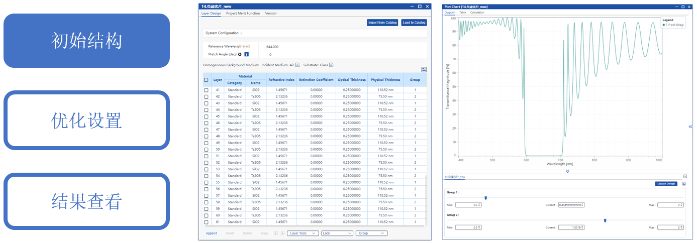 通過逐漸減小四分之一堆棧中低折射率層的厚度、同時相應增加高折射率層的厚度,可以有效減小高反射區(qū)的寬度。在軟件中,將所有低折射率膜層被設定為一組,高折射率膜層設定為另一組。用戶可在光譜圖中通過調(diào)整這兩組的厚度系數(shù),實現(xiàn)低折射率膜層整體減小、高折射率膜層整體增大,從而使截止帶的位置和寬度更接近目標指標。