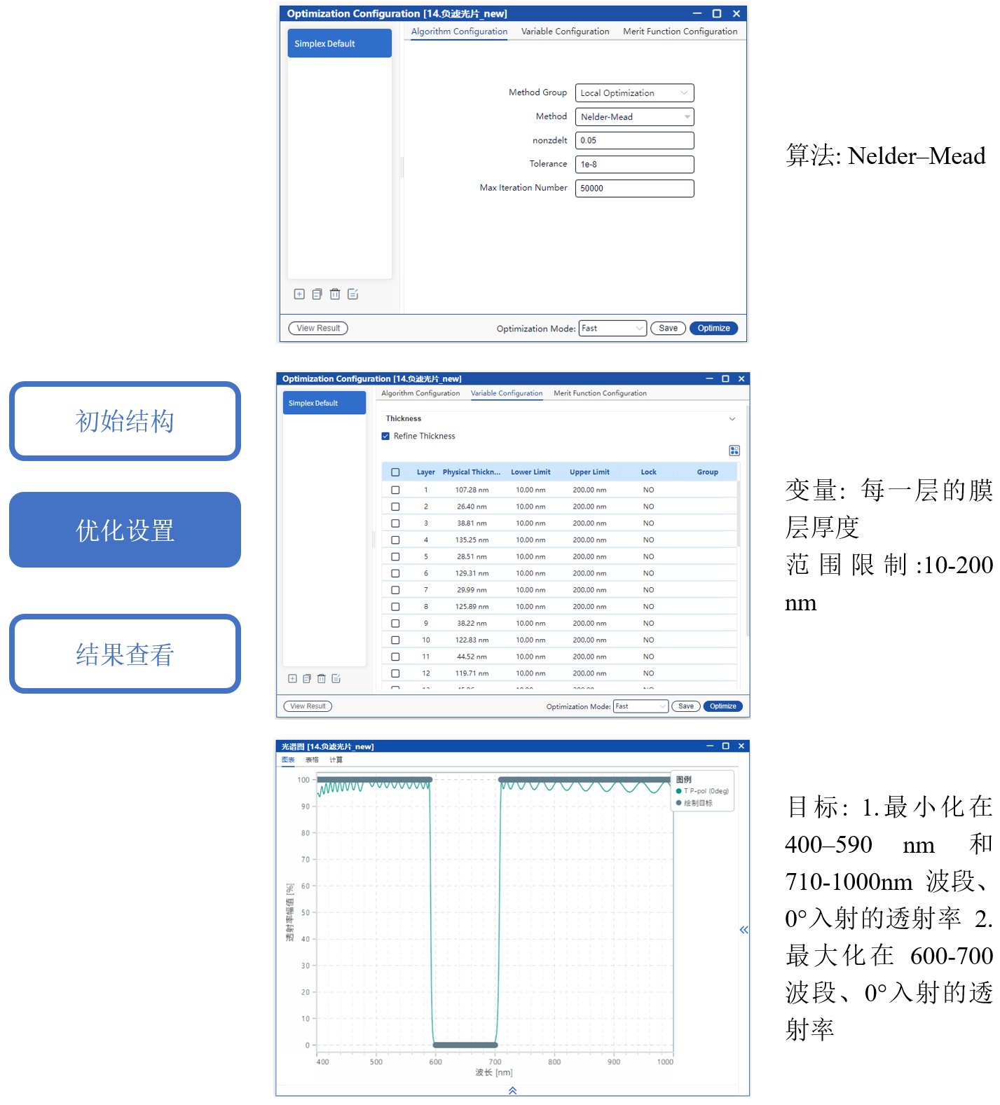 采用 Nelder-Mead 算法對各層厚度進行優(yōu)化,目標是最大化通帶透射率同事最小化截止帶透射率。