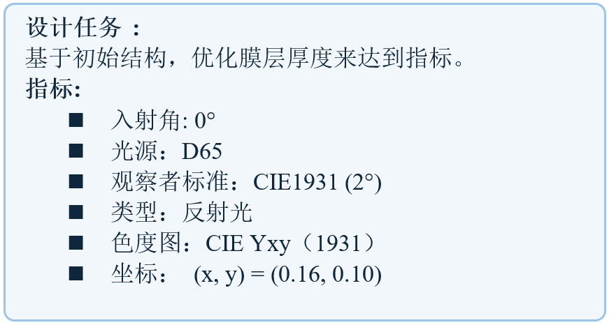 設(shè)計一個顏色膜,通過優(yōu)化初始結(jié)構(gòu)的厚度,目標(biāo)是在0°入射條件下實(shí)現(xiàn)反射光色坐標(biāo)嚴(yán)格匹配D65光源下的藍(lán)紫色域(CIE 1931標(biāo)準(zhǔn)),目標(biāo)值為(x,y)=(0.1607,0.1032).