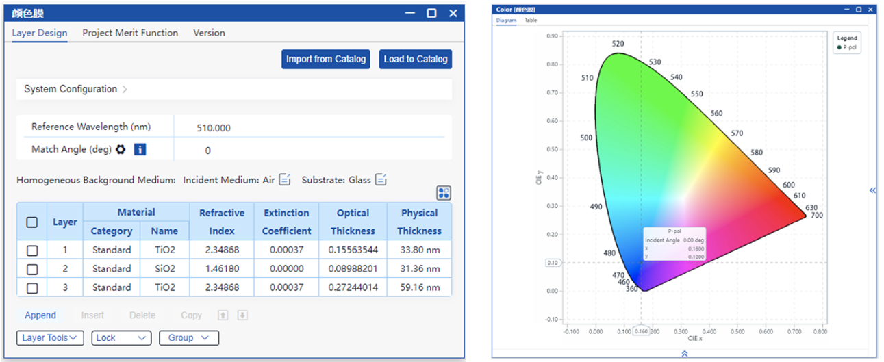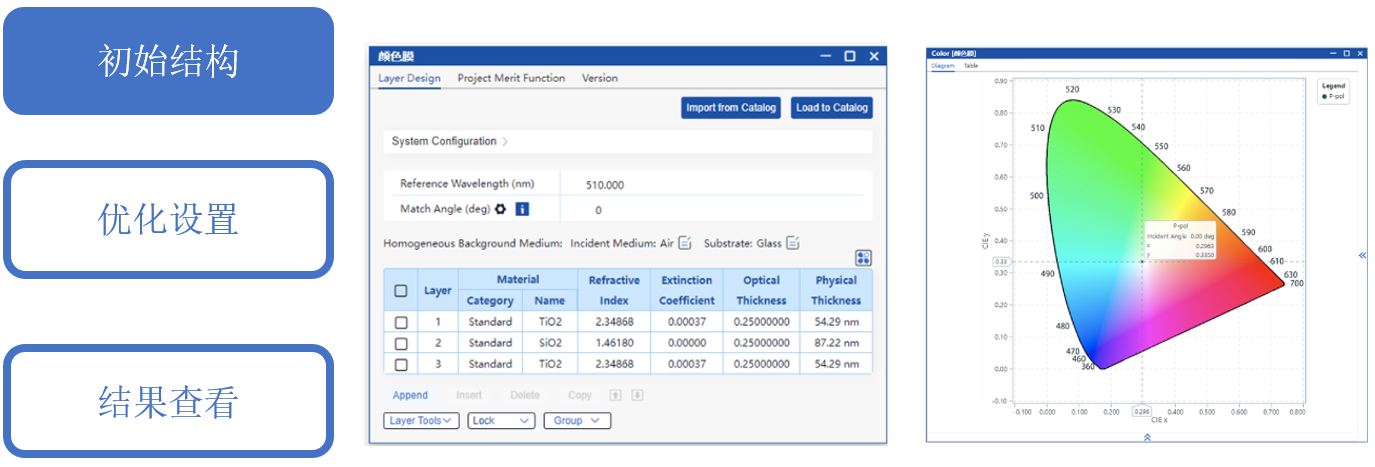 初始結(jié)構(gòu)的反射色見右圖,可以看出此時的反射色接近白色,需進(jìn)一步通過優(yōu)化工具調(diào)整膜厚以實(shí)現(xiàn)目標(biāo)顏色值。