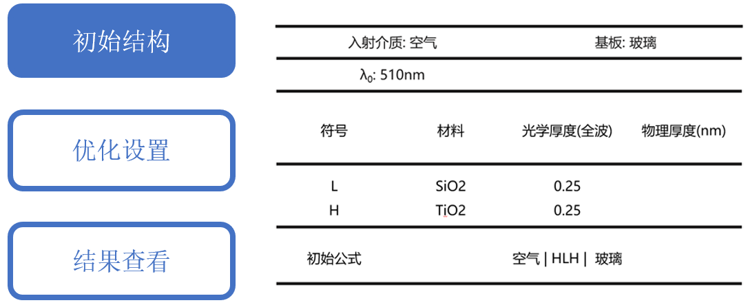 本設(shè)計采用典型的顏色膜設(shè)計:  TiO2-SiO2-TiO2作為初始結(jié)構(gòu),該結(jié)構(gòu)常用于可見光波段的反射色控制。