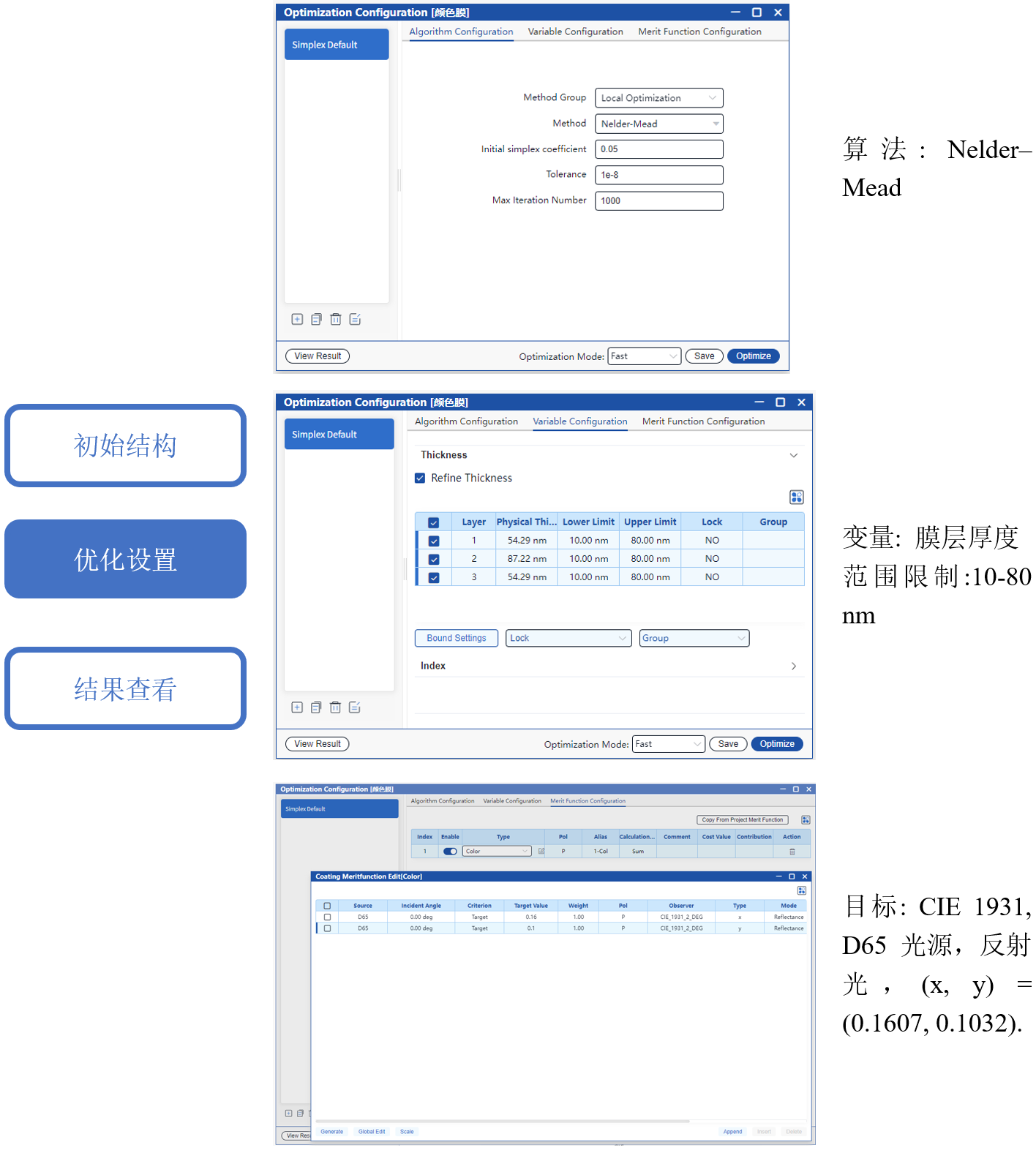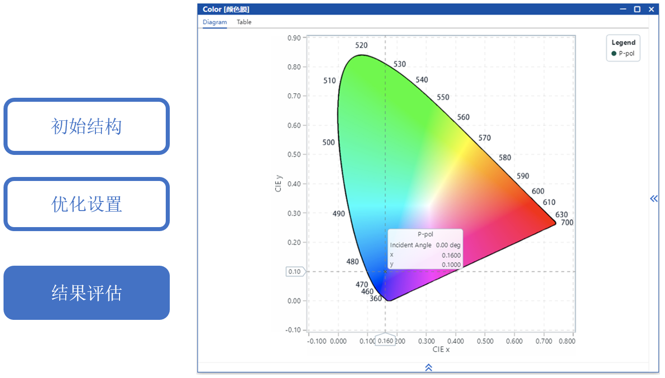 使用單純形算法優(yōu)化各層厚度,目標(biāo)是達(dá)到設(shè)定的色品圖顏色目標(biāo)(x, y) = (0.16,0.10)。