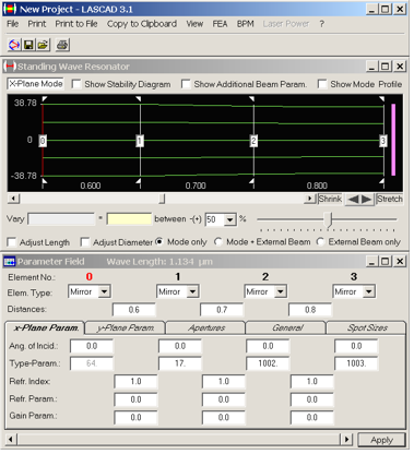 上方的窗口是有4個(gè)元件的簡(jiǎn)單腔的模式圖,下方窗口顯示這個(gè)腔的參數(shù)。在每一個(gè)元件的下面的一列里顯示這個(gè)元件的參數(shù),比如在標(biāo)有“Type-Param”的一例里顯示每個(gè)鏡的曲率半徑?梢杂脴(biāo)有元件序號(hào)的下拉框按鈕來(lái)改變相應(yīng)元件的類(lèi)型,可以選擇Mirror、Dielectric Interface或者Lens類(lèi)型。每一元件序號(hào)下面的列顯示相應(yīng)的兩元件的空間屬性,比如折射率、“Refractive Parameter”(表示相應(yīng)的拋物線(xiàn)型折射率分布的二階導(dǎo)數(shù))。關(guān)于這個(gè)窗口的其他功能的描述可以在第3節(jié)、快速入門(mén)或者使用手冊(cè)中找到。