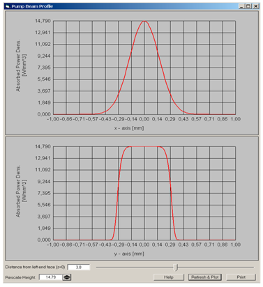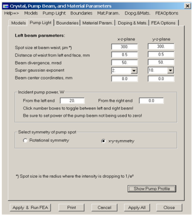 在“Incident pump power, W”標(biāo)簽的對(duì)話(huà)框中可以分別定義晶體左右端面的泵浦功率。對(duì)端泵而言,通常泵浦光束聚焦到棒中。在"Spot size at beam waist", "Distance of waist from left end face" 和"Beam divergence"的對(duì)話(huà)框中可以定義相關(guān)量的大小。