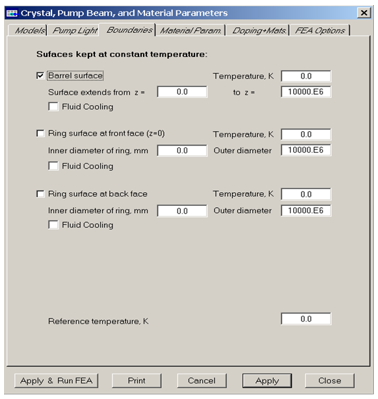 單擊LASCAD 主窗口中的“FEA/Parameter Input & Start of FEA Code”打開(kāi)標(biāo)題為“Crystal, Pump Beam and Materials Parameters”的窗口,如圖2。注意有六個(gè)標(biāo)簽頁(yè)來(lái)定義不同的參數(shù)組。