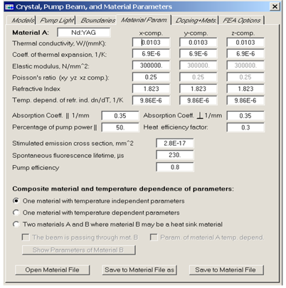 “absorption coefficient”描述由于泵浦光的吸收,泵浦光按 呈指數(shù)衰減,它也與摻雜濃度有關(guān)系。各向異性的晶體對泵浦光的吸收還與泵浦光的偏振態(tài)有關(guān),這種情況下的吸收因子可以定義為兩個(gè)獨(dú)立的偏振方向。更詳細(xì)的描述請參閱LASCAD 手冊的附錄部分。對Nd:YAG晶體,只需要輸入相等的值到相應(yīng)的對話框。