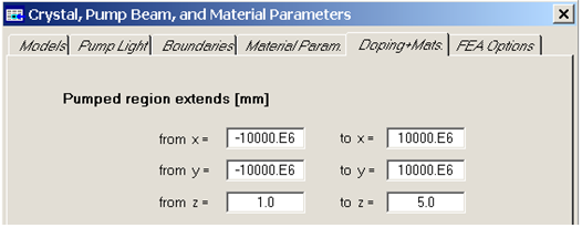 在現(xiàn)在這個(gè)例子中,我們用輸入框定義端蓋未摻雜的棒的泵浦區(qū)域范圍[mm]from z=1.0 to z=5.0意思是說,泵浦光只有在1 ≤ z ≤ 5 mm這個(gè)摻雜區(qū)域才被吸收。由于我們例子里使用的晶體是6mm長,我們定義兩非摻雜端蓋為1mm長。