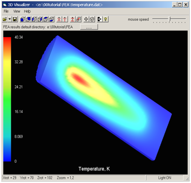 點(diǎn)擊LASCAD主菜單選擇“FEA/3D Visualizer”命令來顯示FEA結(jié)果的3D圖形,這是一個(gè)基于OpenGL的易于操控的三維觀察器。圖9顯示了一個(gè)溫度分布的3D圖形。由于在2.5節(jié)中定義了端面非摻雜,因此溫度上升限制在棒的內(nèi)區(qū)域。