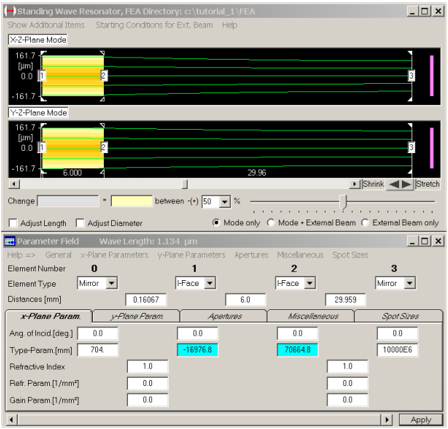 可以通過“Parameter Field”窗口中“Type-Param”對話框的參數(shù)來改變端面透鏡的曲率。也可以這樣改變元件的參數(shù):單擊“Parameter Field”窗口中的任意對話框,然后拖動(dòng)“Standing Wave Resonator”窗口下方的滑動(dòng)條,就可以相應(yīng)改變這個(gè)對話框中的數(shù)據(jù)。這種方法在使用手冊和快速入門中都有描述。