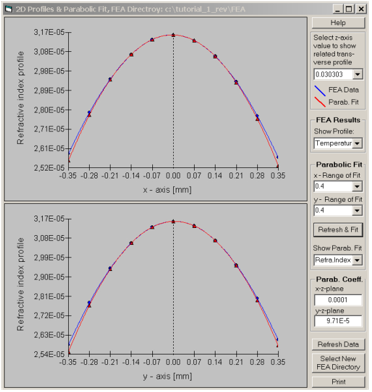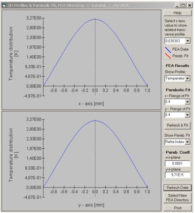 再次,可以使用窗口右上角的下拉框顯示沿z軸的擬合位置,擬合區(qū)域的拋物線因子在“Parab.Coeff”對話框顯示。另外,這些因子被寫到“FIT.dat”文件中并保存在FEA子目錄下。