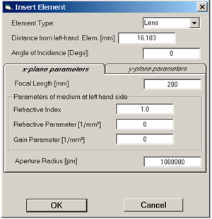 可以在對話框中定義元件類型,比如焦距、曲率半徑等等。如果要?jiǎng)h除某個(gè)元件,按下CTRL 鍵的同時(shí)用鼠標(biāo)指向需要?jiǎng)h除的元件后按下左鍵,這時(shí)會(huì)彈出一個(gè)消息框,單擊確定就刪除了指向的那個(gè)元件。用這樣的方法,熱透鏡同樣可以刪除。