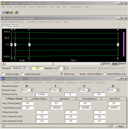現(xiàn)在你可以看到在頂部的LASCAD的主菜單和在它下面的另外兩個(gè)窗口,一個(gè)標(biāo)題為“Standing Wave Resonator”,另一個(gè)是“Parameter Field”,如圖1所示。上面的窗口顯示了有四個(gè)元件的簡單腔的模式圖,下面的窗口顯示腔的參數(shù)。在元件編號下面的縱行顯示的是該元件的參數(shù),比如每個(gè)反射鏡的曲率半徑,在行標(biāo)簽“Type-Param”里顯示。想要改變元件類型,可以直接使用元件編號下面的下拉框,你可以選擇反射鏡、介質(zhì)界面和透鏡。元件編號之間的縱行里顯示的參數(shù)定義了各元件之間的空間的特性,例如折射率,或者由拋物線折射率分布的二次微分導(dǎo)出的“Refractive Parameter”。關(guān)于這個(gè)窗口中其它的功能,例如如何插入或者清除一個(gè)元件,你可以在快速瀏覽第三部分或者手冊里面找到。