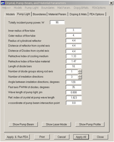 點(diǎn)擊LASCAD主窗口的菜單項(xiàng)“FEA/Parameter Input & Start of FEA Code”,打開題為“Crystal,Pump Beam and Materials Parameters”的窗口,如圖2所示。注意六個(gè)標(biāo)簽,用于定義不同類型的參數(shù)。