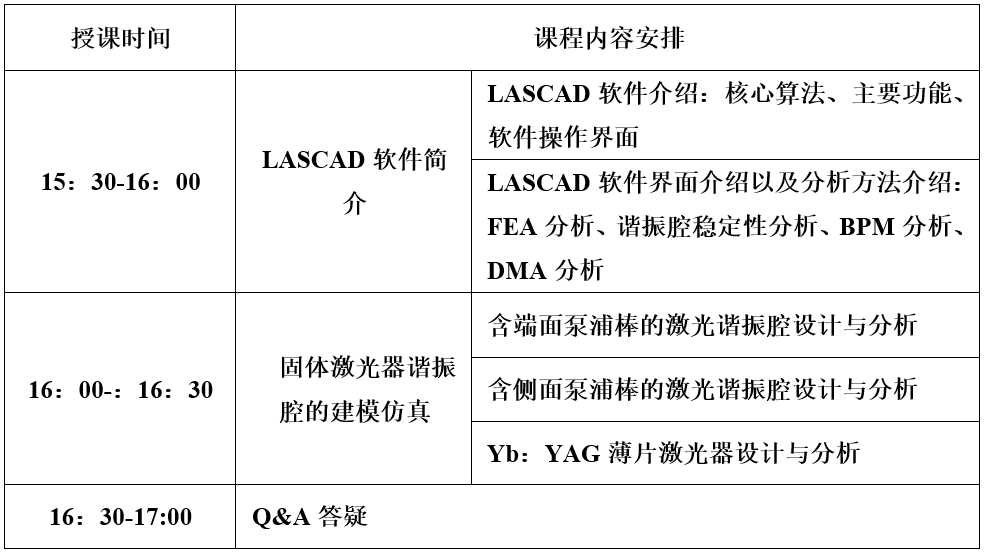 本課程重點(diǎn)突出LASCAD軟件的基本應(yīng)用模塊、軟件操作及開(kāi)發(fā)工具。利用LASCAD在固體激光器熱效應(yīng)分析方面的全面功能,展示軟件FEA算法介紹、諧振腔穩(wěn)定性分析、BPM分析、DMA分析。