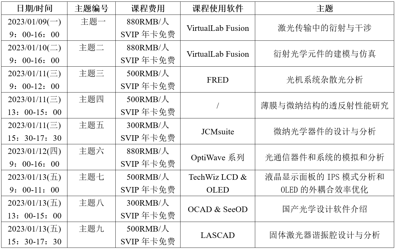 歡迎大家參加熱門光學(xué)軟件之初體驗(yàn)網(wǎng)絡(luò)課程,1月13日上午,光液晶顯示面板的IPS模式分析和OLED的外耦合效率優(yōu)化(基于TechWiz軟件),1月13日下午國(guó)產(chǎn)軟件介紹,1月13日下午固體激光器諧振腔設(shè)計(jì)與分析(基于LASCAD軟件)