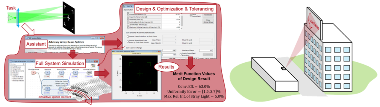 2. 在第二個(gè)例子中,我們將通過一個(gè)可能的工作流程來設(shè)計(jì)和分析使用光擴(kuò)散DOE的光學(xué)設(shè)置,以在建筑物的正面創(chuàng)建LightTrans標(biāo)志。