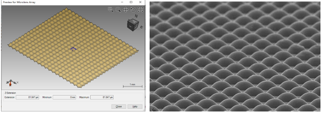 左圖:VirtualLab Fusion設(shè)計(jì)的微透鏡陣列 右圖:加工的微透鏡陣列結(jié)構(gòu)