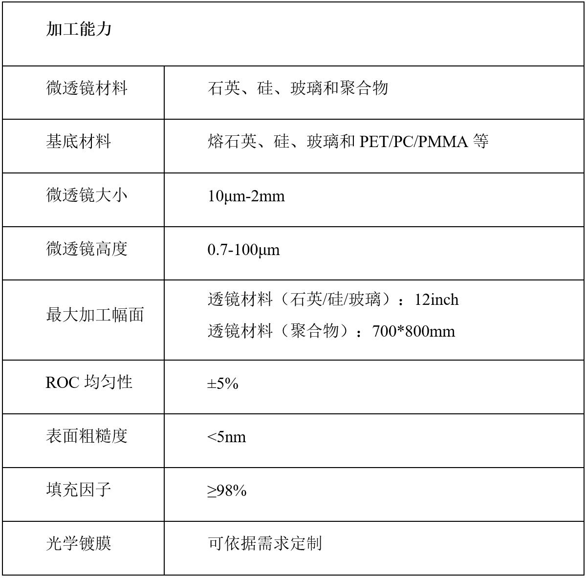 目前,我們采用納米壓印技術(shù)加工微透鏡陣列,可以在玻璃、PET/PC、硅、金屬或集成電路晶圓等各種材料或器件表面制作微透鏡陣列。微透鏡的材質(zhì)是高透光率、耐高溫的聚合物,如環(huán)氧樹(shù)脂或丙烯酸酯。