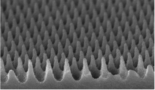 蛾眼結構可以減少反射率,原因在于:當材料表面納米結構尺度小于光波長時,光波無法辨認出該納米結構,而圓錐型的蛾眼結構可以使材料表面的折射率沿深度方向呈連續(xù)變化,從而減小折射率急劇變化所造成的反射。