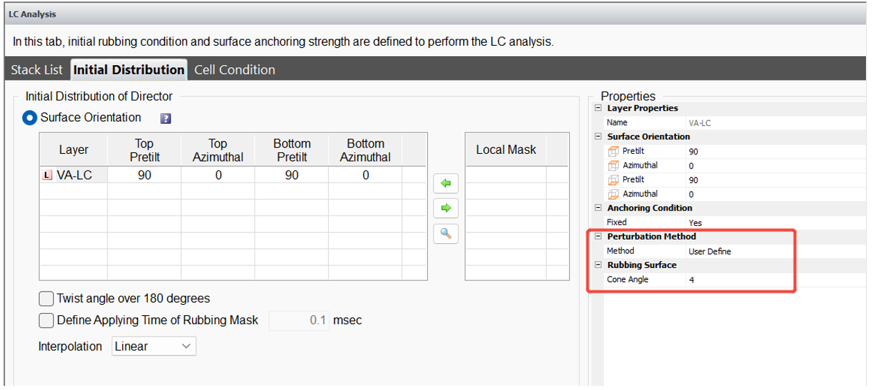 在實際的摩擦過程中,液晶分子并不是按照摩擦方向均勻排布的,此軟件的微擾法選項(Perturbation Method)允許液晶分子以類似于實際摩擦過程的方式移動,當使用了微擾方式時,液晶分子在表面取向中指定的摩擦角度相關的隨機方向進行布。
