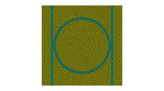 在本案例中,所有進入器件的波導(dǎo)具有相同的幾何形狀。通過環(huán)形諧振腔和兩個平行波導(dǎo)的組裝,建立二維幾何結(jié)構(gòu):