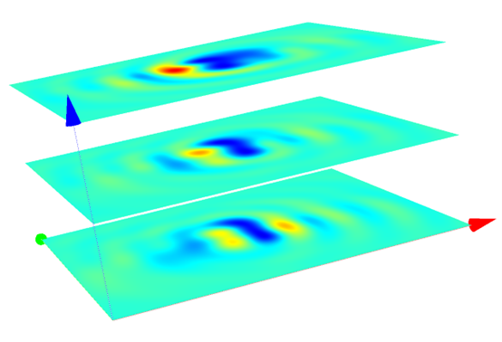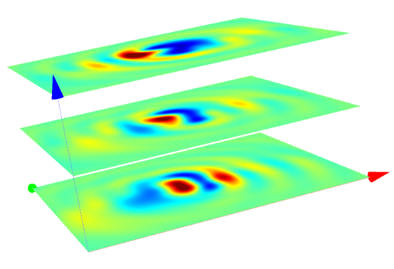 在第一個(gè)后處理中,計(jì)算上半部分空間的傅里葉變換(輸出至文件transmitted_fourier_transform.jcm)。在后續(xù)處理的光學(xué)成像中,這個(gè)傅里葉變換被映射到image_fourier_transform.jcm文件中,模擬光通過光學(xué)系統(tǒng)傳輸(定義在后處理光學(xué)成像)。您可以使用笛卡爾輸出后處理來計(jì)算這樣形成的相干圖像。下圖顯示了S偏振光照明下不同z方向切片(圖像平面沿z方向位移)的圖像。