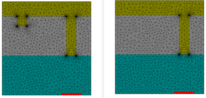 狹縫槽設(shè)置(左)和用于歸一化的狹縫設(shè)置(右)的三角形網(wǎng)格;灰色:銀膜,藍色:基板,紅色:檢測器區(qū)域,綠色:空氣;請注意金屬角處網(wǎng)格的預(yù)細化。
