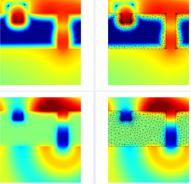 計算后場強度,有有限元網(wǎng)格部分(右)和沒有限元網(wǎng)格部分(左)(頂行:  圖 ,底行:   圖 ,偽色標(biāo))。