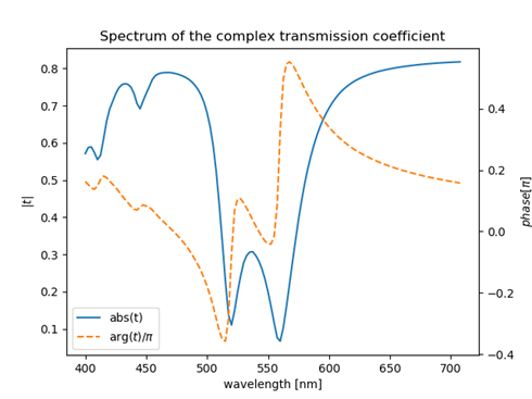 下圖描繪了透射系數(shù)的幅值和相位(由于對稱性,這與偏振性無關(guān)):