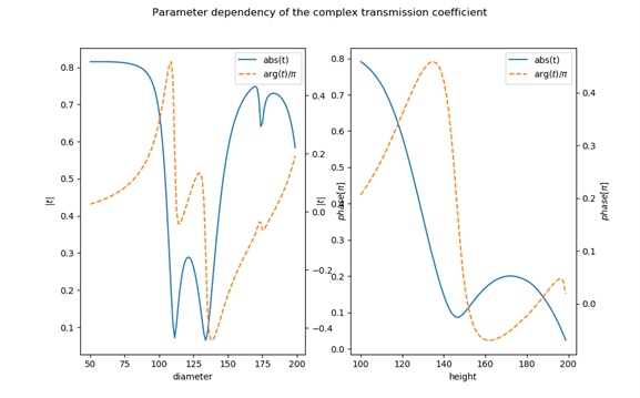 納米片半徑和高度的變化會影響相位和透射率。這個光譜特性使用腳本data_analysis/run_scan_geometry.py來研究。在這里,納米片的直徑和高度發(fā)生了變化,并記錄了相位和透射的變化。